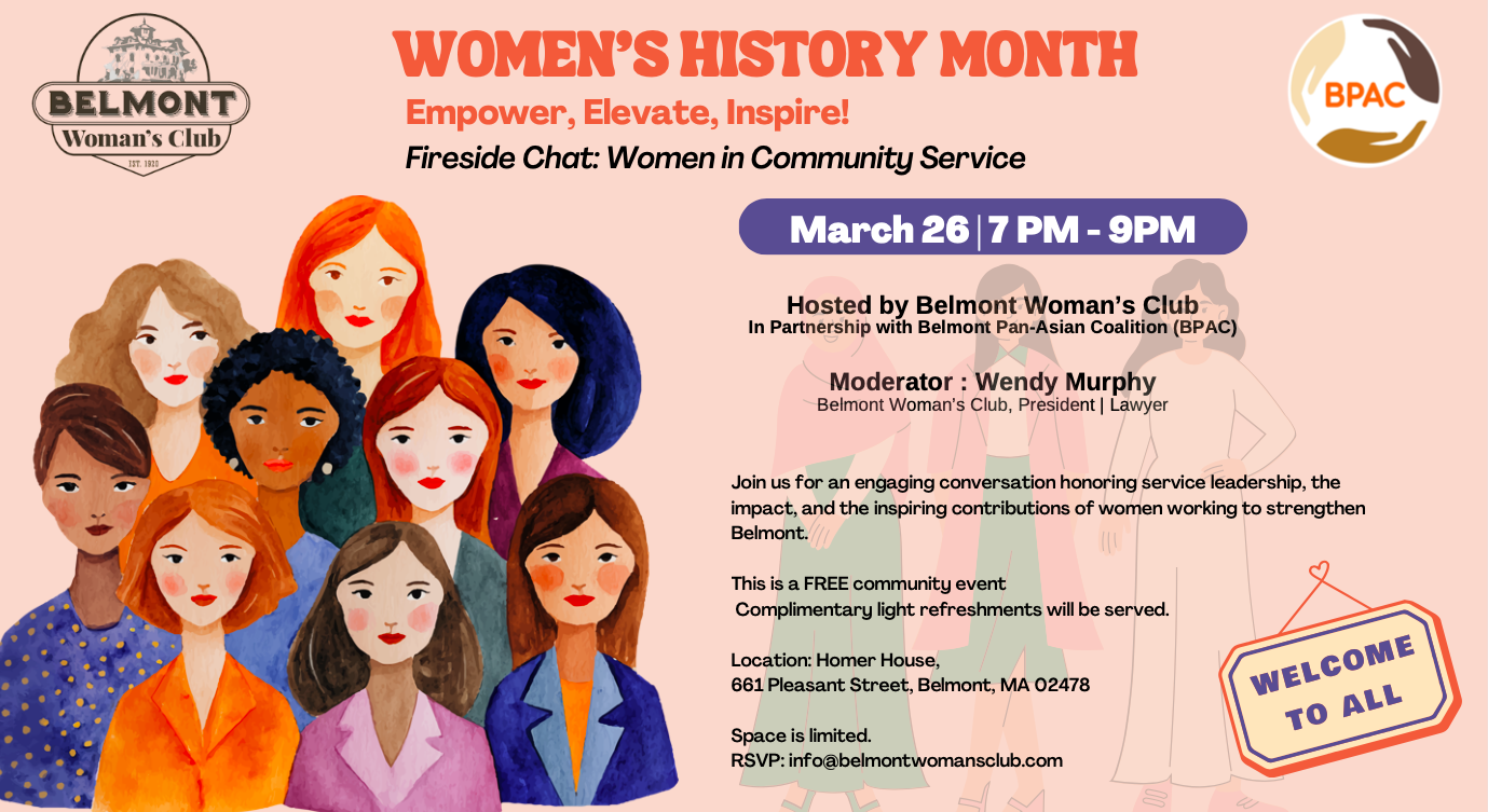 In collaboration with Belmont Woman’s Club, B-PAC is excited to announce our second Women’s History Month event to celebrate Women in Community Service—a panel discussion and fireside chat dedicated to honoring service leadership, their impact, and the inspiring contributions of women working to strengthen Belmont and beyond.