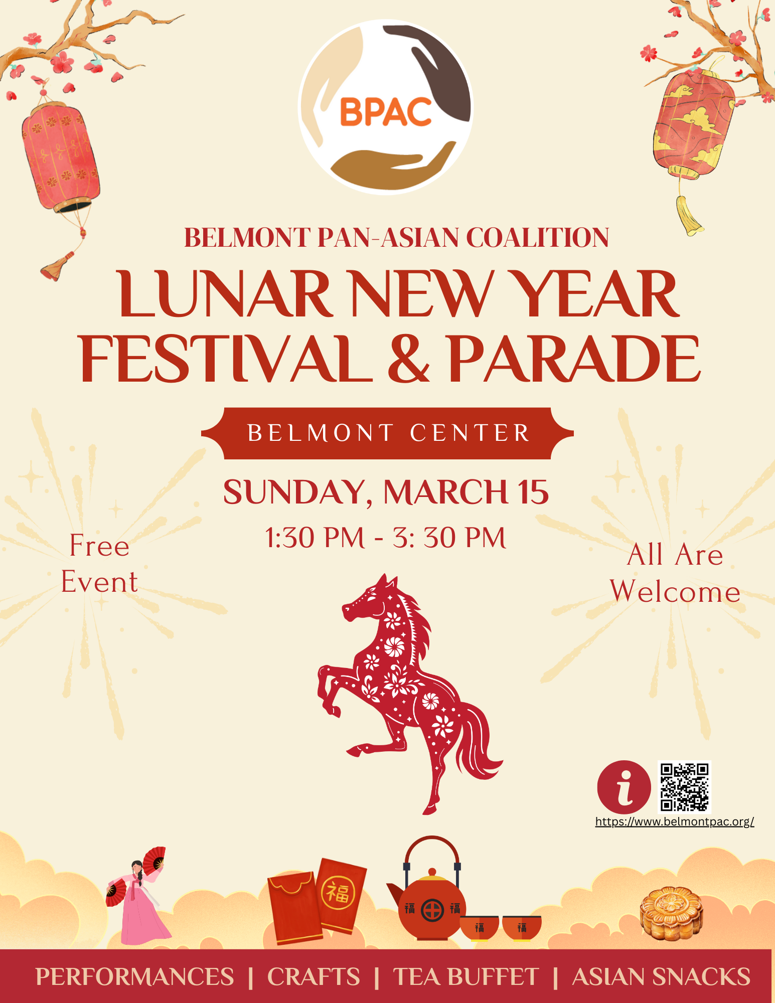 Join the Belmont Pan-Asian Coalition (BPAC) for a joyful, multicultural Lunar New Year celebration in the heart of Belmont Center! We’ll gather at the intersection of Moore and Leonard Streets on Sunday, March 15, from 1:30–3:30 PM to celebrate culture, community, and the start of the new year together.